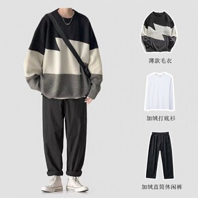 拼色宽松型蓝色加绒立领现货春秋季休闲长袖青年毛衣1...