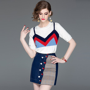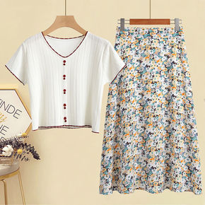 大码女装夏季套装女2022新款短袖针织衫遮肚显瘦碎...