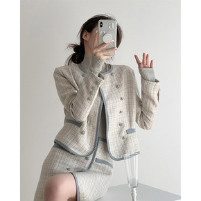 春装2022年新款女小香风v领千鸟格针织连衣裙小个...