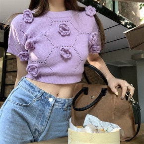2022春夏新款韩版可爱立体花朵镂空露脐短款上衣套...