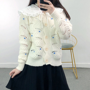 可爱减龄风娃娃领针织衫开衫女士2021秋冬新款短款...