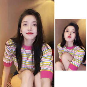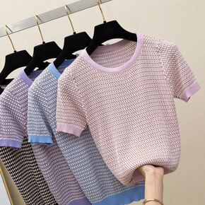 实拍小圆领针织条纹短袖恤女可爱新款2022夏季宽松...