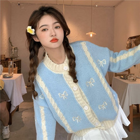 春季可爱日系毛衣女圆领长袖蝴蝶结拼色温柔休闲针织衫...