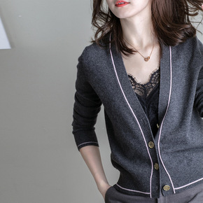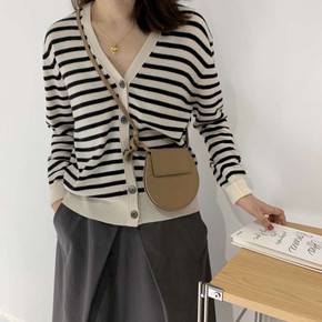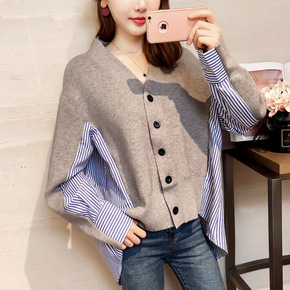 2022春秋季新款针织开衫女V领宽松显瘦条纹外套韩...