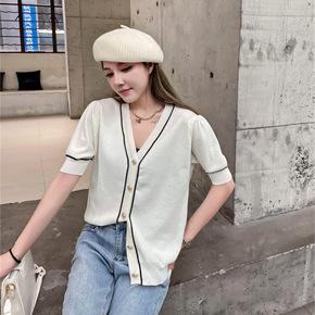 春夏针织开衫女2021新款V领拼色短袖显瘦外搭宽松...