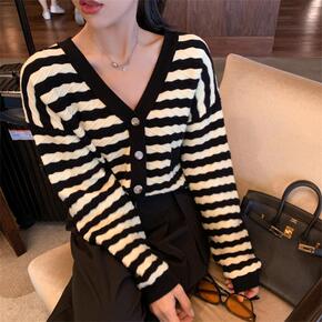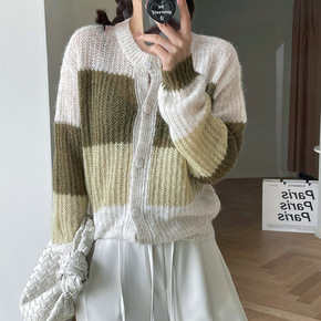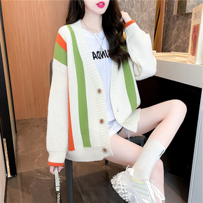 撞色条纹毛衣开衫女装2021秋冬新款韩版宽松甜美短...