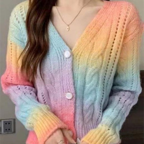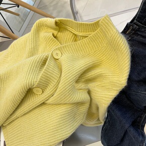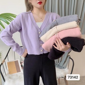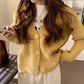 简约小香风排扣针织衫女纯色V领长袖毛衣宽松显瘦短款...