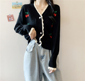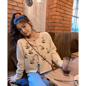 复古绣花毛衣外套套装女2021年新款早秋宽松V领上...