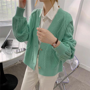 2021秋季新款麻花短款针织开衫简约时尚灯笼袖宽松...
