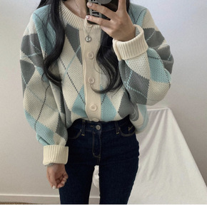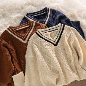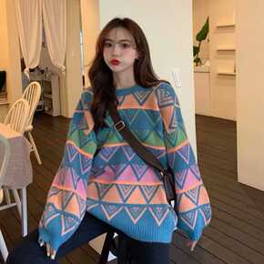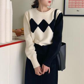 新款韩版菱形撞色圆领套头毛衣内搭慵懒风针织学生洋气...