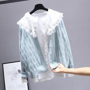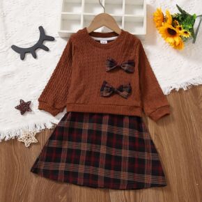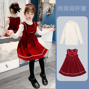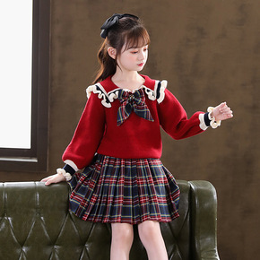 2021冬季童装新款女童甜美花边毛衣蝴蝶结丝绒裙两...