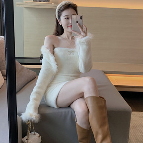 冬季网红女短款毛毛边外套+性感抹胸修身包臀连衣裙两...