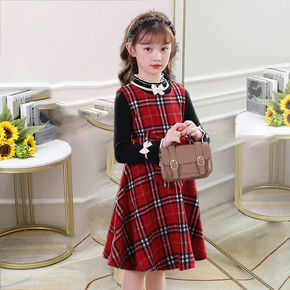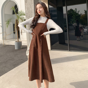 实拍 2021秋冬季新款韩风复古格子毛呢背带裙+打...