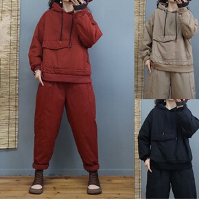 冬季复古纯色棉衣棉裤女2021年新款夹棉加厚连帽卫...