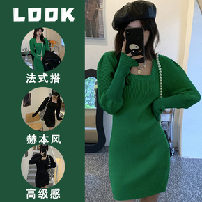 法式小个子宽松显瘦针织连衣裙女秋冬设计感中长款绿色...