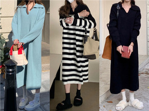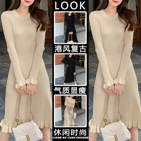 秋冬装中长款水貂绒毛衣女士加绒加厚连衣裙纯色修身针...