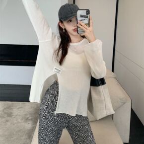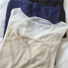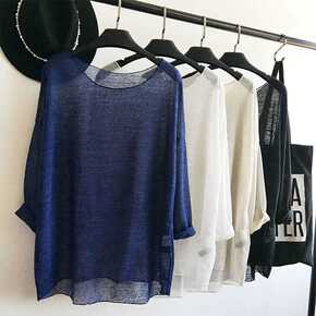 轻薄大圆领横纹理套头衫 春夏透视小性感宽松防晒针织...