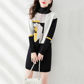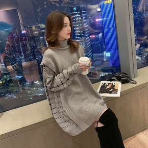 2022冬装新款韩版高领拼接假两件中长款毛衣女宽松...