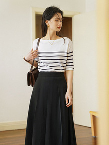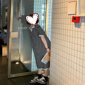 复古小条纹 polo领天丝针织短袖T恤女/宽松中长...