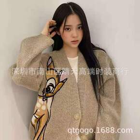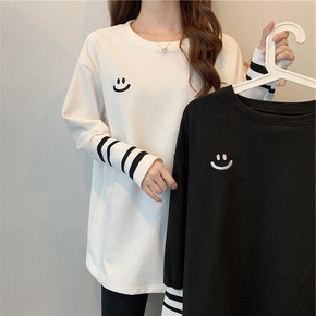 双面德绒刺绣笑脸T恤女秋冬长袖中长款百搭针织上衣宽...