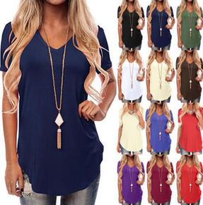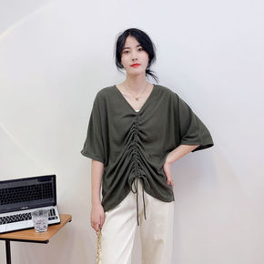 夏季女装新款韩版简约V领百搭宽松套头T恤纯色中袖休...