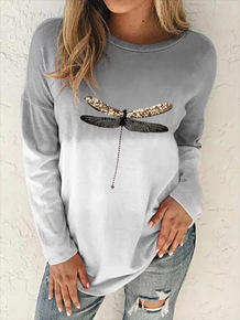 亚马逊速卖通欧美女装新款宽松领珠片绣花蜻蜓园长袖T...