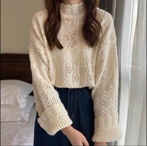 实拍秋季2021新款韩版宽松设计感提花缕空半高领长...