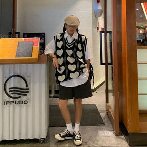 实拍韩版秋季新款v领提花爱心马甲女学生宽松百搭针织...