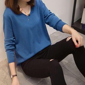 大码秋装女新款洋气长袖V领宽松显瘦纯色打底衫女学生...