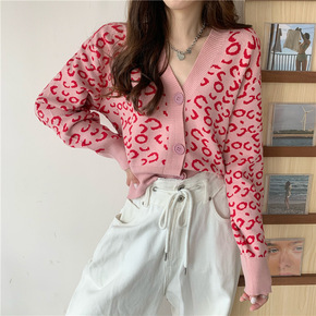 百优工厂直销女装复古港味豹纹短款宽松V领长袖针织衫...