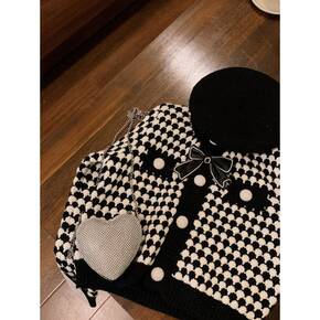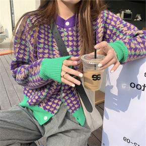 千鸟格毛衣外套女复古撞色新款韩版宽松短款针织开衫百...