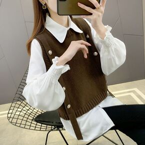 2021年新款春装衬衫女长袖设计感套装毛衣针织马甲...