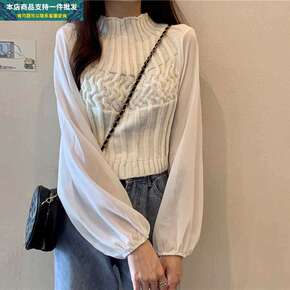 秋季撞色短款针织衫拼接雪纺袖秋装韩版V领显瘦学生灯...