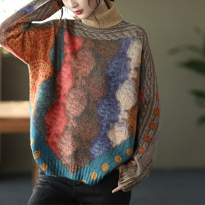 毛衣女新款水貂绒斑马纹圆领半高领毛衣休闲中长款针织...