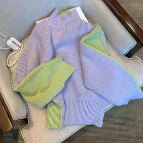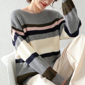 2021秋冬新品 女式圆领套头撞色提花针织毛衣 一...