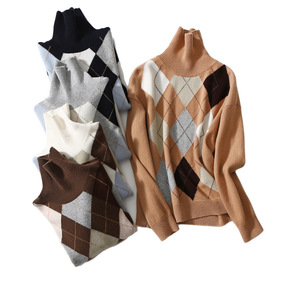 批发2021秋冬款嵌花工艺菱形格纹高领针织羊毛衫 ...