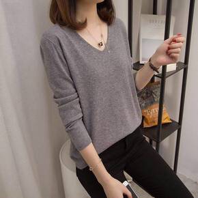 v领上衣长袖针织毛衣女2021年新款修身打底衫秋冬...