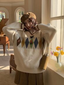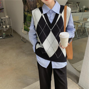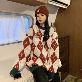 学院风菱格套头毛衣女2022春秋新款宽松复古V领马...