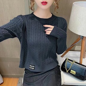 2188冬季新款女装欧美风圆领短袖麻花纹理针织套头...