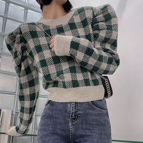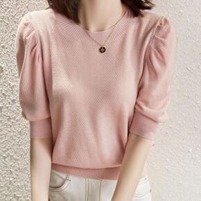 复古褶皱泡泡袖圆领套头短款针织毛衣女2022新款小...