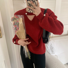 子川纯色羊毛露肩长袖针织衫女2022早秋新品韩版宽...