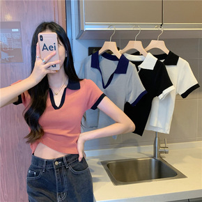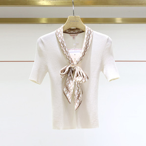 2022夏季新品V领系带蝴蝶结短袖薄款修身拼接针织...