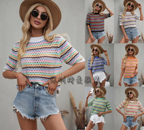 跨境春夏亚马逊新款欧美拼接镂空针织衫宽松间色圆领条...