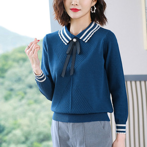黑白条纹针织衫女2021年早秋新款POLO领毛衣设...
