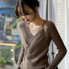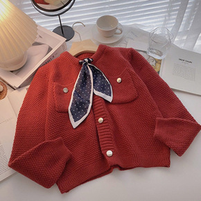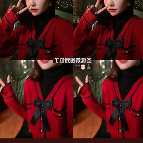 毛衣外套开衫女2021年秋冬新款韩版港味复古系带圆...