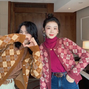 许大晴 复古红色格纹针织开衫女冬慵懒风加厚外穿短款...