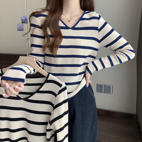 大码V领条纹针织内搭打底衫女秋季2022新款胖mm...