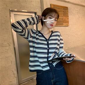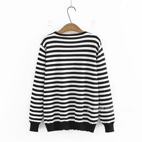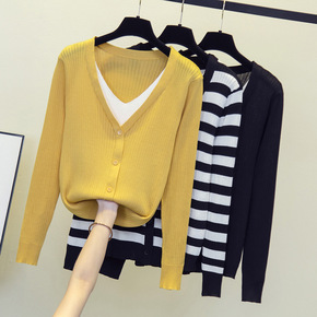 撞色条纹v领针织衫上衣女春秋季韩版大码胖妹妹宽松长...