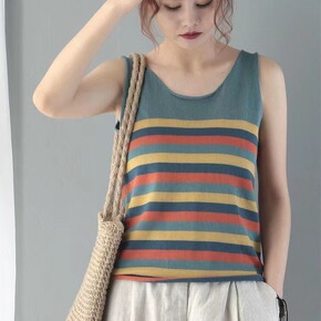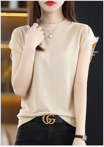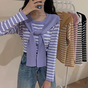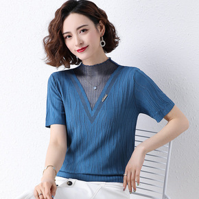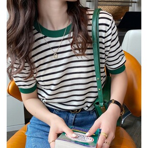 冰丝短袖针织衫女薄款条纹T恤大码韩版打底夏季半袖短...