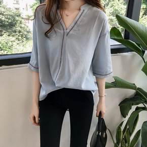 2021夏装女装新款复古刺绣短袖衬衫女宽松显瘦ch...